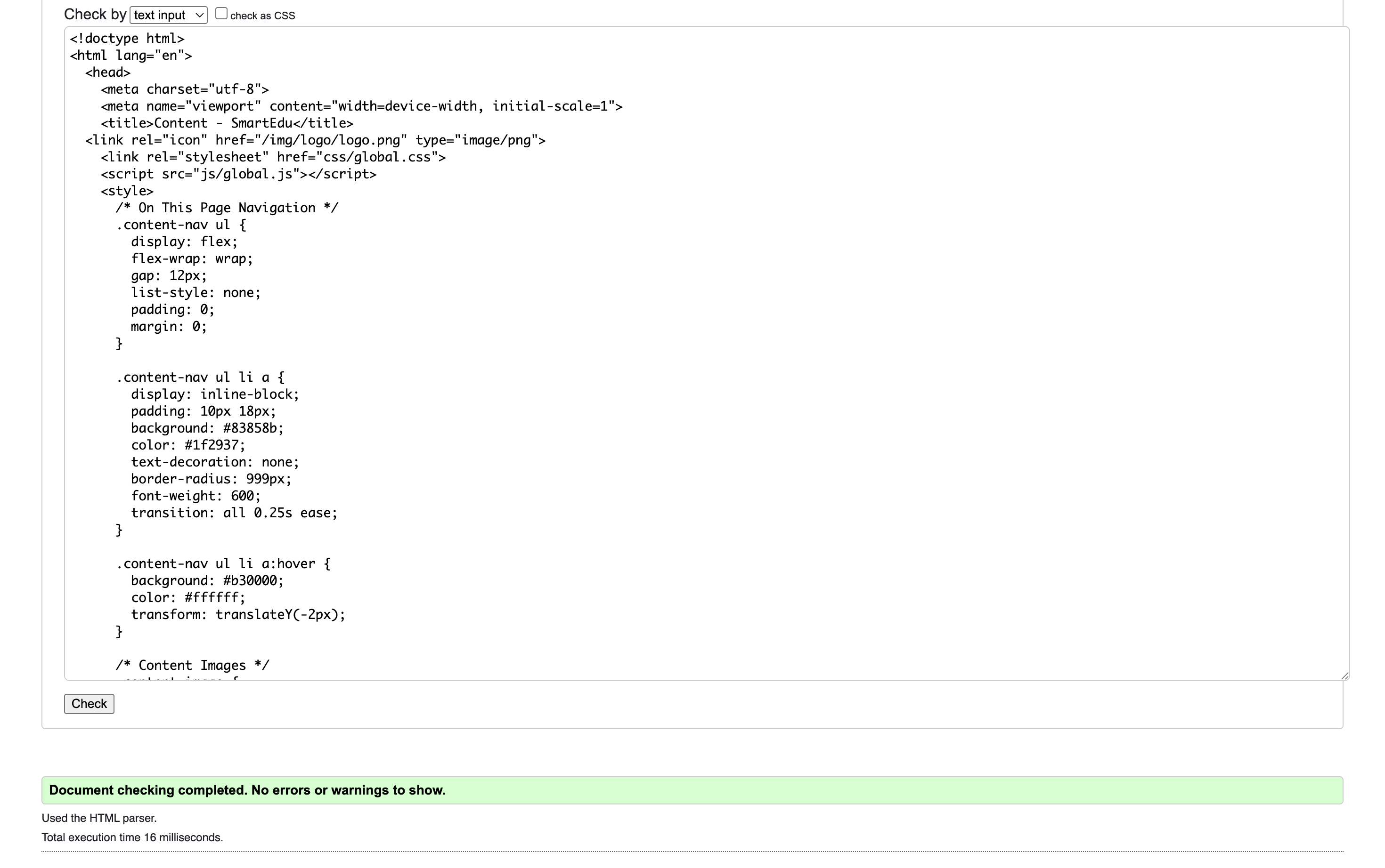The validation for my Content Page confirmed that the headings are well organized and easy to read. I also checked that all internal links work correctly, and the report shows that the page follows accessibility rules and university project standards.