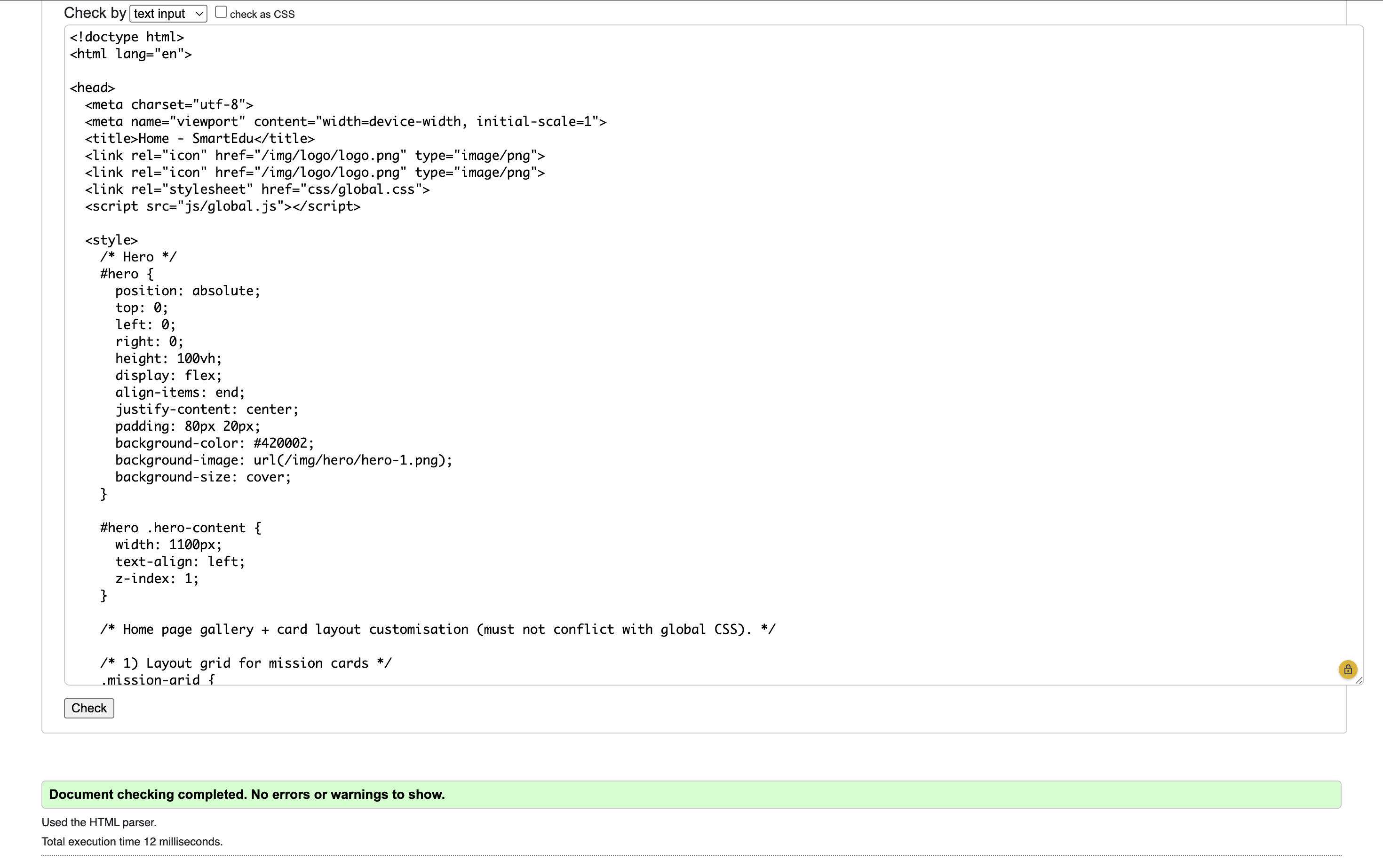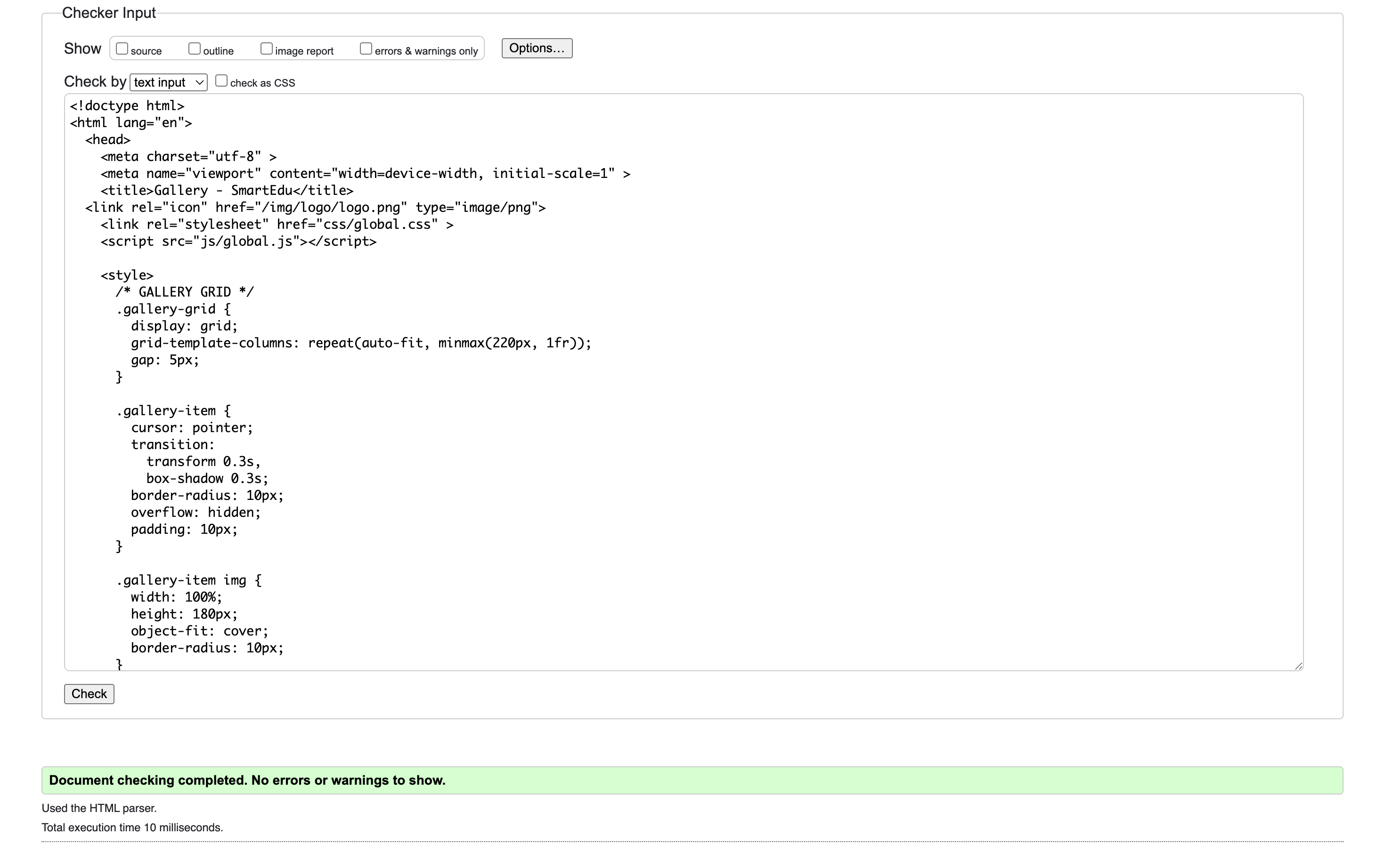 The validation for my Gallery Page was successful after fixing a few small grid issues. I also checked that the image pop-up works smoothly and confirmed that all images include proper descriptions, making the page ready for users.